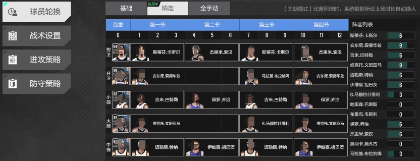 游戏里面有多种战术选择,在面对不同对手来调节战术,比如对手内线较弱,可多安排内线强攻战术,对手防守较强,可采外线三分战术寻找机会,主要资金可以用于主射手球员,这样性价比会最高,也能用阵容总价值最低换得最高的排位胜率,现在的阵容用大前 - 乔纳森.艾萨克、控卫 - 本.西蒙斯、中锋 - 安德烈.德拉蒙德、分卫 - 德文.布克、小前 - 科怀.伦纳德的组合就不错。