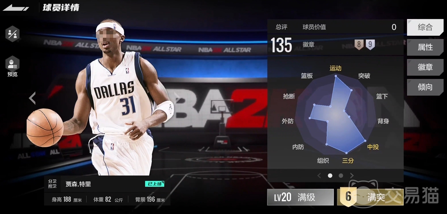 一般来说历史类型的球员相较于新秀球员,往往拥有更为出色的属性和更多的徽章,贾森特里也不例外,他在场上的位置是得分后卫和控球后卫,从身体条件来看,身高188厘米,体重82公斤,臂展196厘米,这样的身材在篮球场上属于小个子球员,但也正因如此,他在场上展现出了极为灵活的身手,通过雷达图可以清晰地看出,他的运动、中投、三分这三项属性都接近满值,这是他在进攻端的核心竞争力。