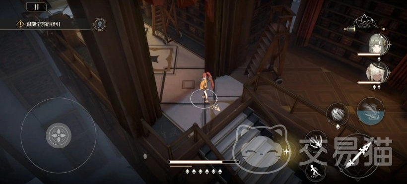 在1-13任务中,玩家需要从图中位置沿着箭头方向的楼梯前进,击败敌人后继续上楼,并与光点进行交互。查看内容后,玩家即可获得宝箱。随后,玩家需要从楼梯下来,左转并向前走一小段距离,与书架旁的光点进行交互,即可获得宝箱。