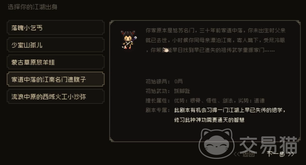 二周目内会出现许多新的分支,例如新的出生天赋,例如,玩家在一周目内只能通过少林寺出生,学会狮子吼,在此时,玩家可以直接进行解锁,并且二周目还会解锁新的角色,玩家在大世界探索时,可以将新角色纳入自己的队列内。