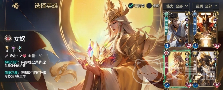 神灵卡牌的属性包括攻击力、生命值和三维属性,这些属性决定了神灵的战斗能力和技能释放条件。例如,女娲卡牌的力量为4,智力为7,敏捷为4,而四方封印技能卡需要8点力量和7点敏捷,因此需要通过加属性的卡牌来达到使用条件。