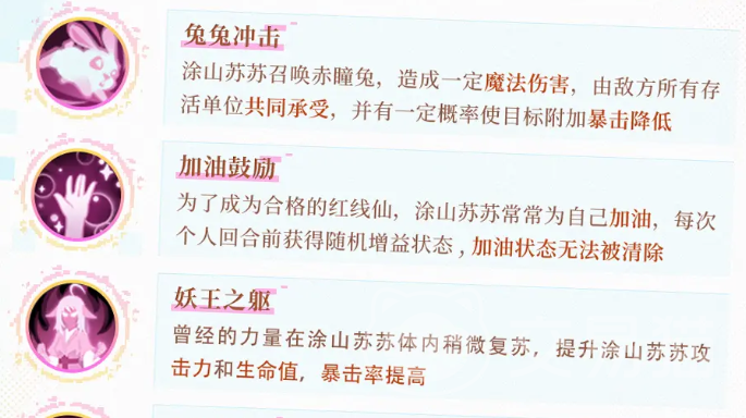 涂山苏苏技能多样,兔兔冲击技能召唤赤瞳兔,释放出一股魔法力量,造成的魔法伤害会由敌方所有存活单位共同承受,在战斗开场,便能对敌方全体施加压力,迅速压低敌方整体血线,还有一定概率使目标附加暴击降低效果,若成功施加能有效限制敌方关键输出角色的爆发能力,涂山苏苏每次在个人回合前,都会使用加油鼓励技能,从而获得随机增益状态,并且这个加油状态无法被清除,让涂山苏苏在战斗中充满不确定性和惊喜,妖王之躯技能使用后,在攻击力、生命值以及暴击率都能够得到提升。