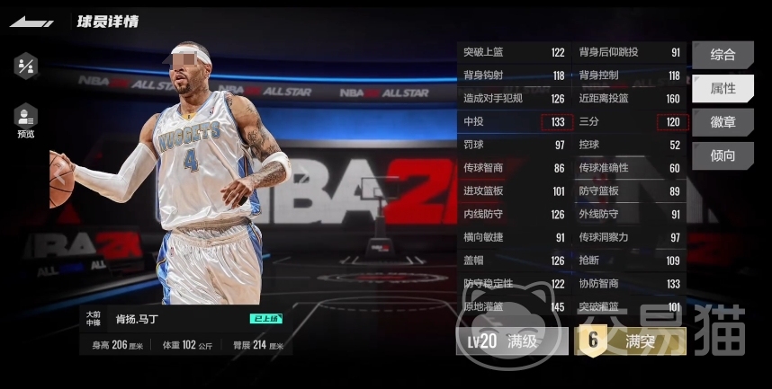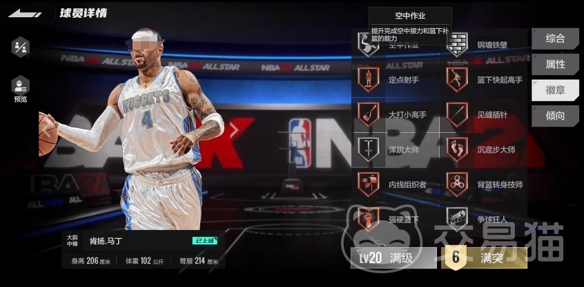 在徽章搭配方面,肯扬马丁拥有多种选择,银色的空中作用徽章、铜色的篮下快起高手、沉底步大师、背蓝转身技师以及强硬篮下徽章与他的球风可以配合,这些徽章能够使马丁在油漆区内展现出强大的进攻威胁,例如篮下快起高手徽章能让他在篮下快速起身完成终结,沉底步大师徽章则有助于他在低位巧妙地利用脚步晃开防守球员,背蓝转身技师徽章使其背身单打后转身投篮的动作更加流畅,强硬篮下徽章更是强化了他在篮下的对抗能力,在激烈的内线肉搏中不落下风。