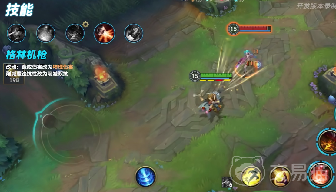 三技能格林机枪,伤害从原先魔法技能,改为了物理伤害技能,并且增设了削弱目标单位双抗性的增益,从而极大程度地增加了物理穿透效果,大招技能伤害并未更改,但是对充能时间进行了变化,充能时间缩短,暴击率提升。