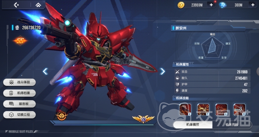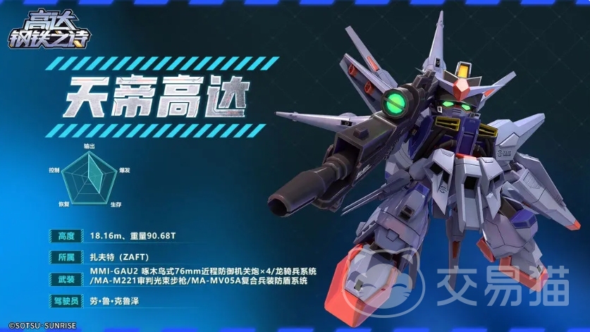 新安洲高达具有出色的战术压制能力,其装备的火箭炮威力巨大,能够穿透3.2米厚的装甲,并且可以将35%的伤害转化为自愈,这提高了其在战场上的生存能力,同时技能4推进器超载能够提升攻击与闪避属性,使其在中远程火力压制方面表现出色,无论是在进攻还是防御端,新安洲高达都能够发挥作用,为团队提供稳定的火力支援。