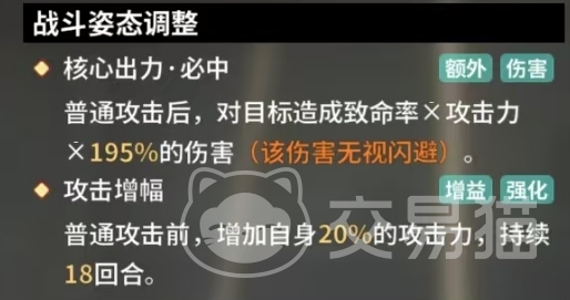 而战斗姿态调整技能则是伊莉雅的又一强大核心出力,在普通攻击之后,它能够对目标造成基于机动力与攻击力的固定伤害,具体伤害数值达到了机动力与攻击力相乘再乘以50%的效果,这种独特的伤害计算方式使得伊莉雅的攻击伤害与她的机动力紧密相连,满级属性下的核心出力更是将伊莉雅的攻击威力推向了一个新的巅峰,同样是在普通攻击之后触发,但它所造成的伤害幅度却大幅提升至机动力与攻击力相乘再乘以 200%的惊人效果,这一巨大的伤害提升使得伊莉雅在面对敌人时,仅需一次普通攻击便能有足够的输出。