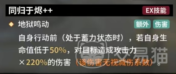 最后要提及的是角色的EX技能,叫做同归于烬,当角色自身行动前持有2层寂灭效果时便会触发,一方面会对目标造成机动力乘以攻击力乘以200%的固定伤害,另一方面角色会获得伤害吸收护盾,该护盾可抵挡2次普通攻击,且在受到多次普通攻击后消失。