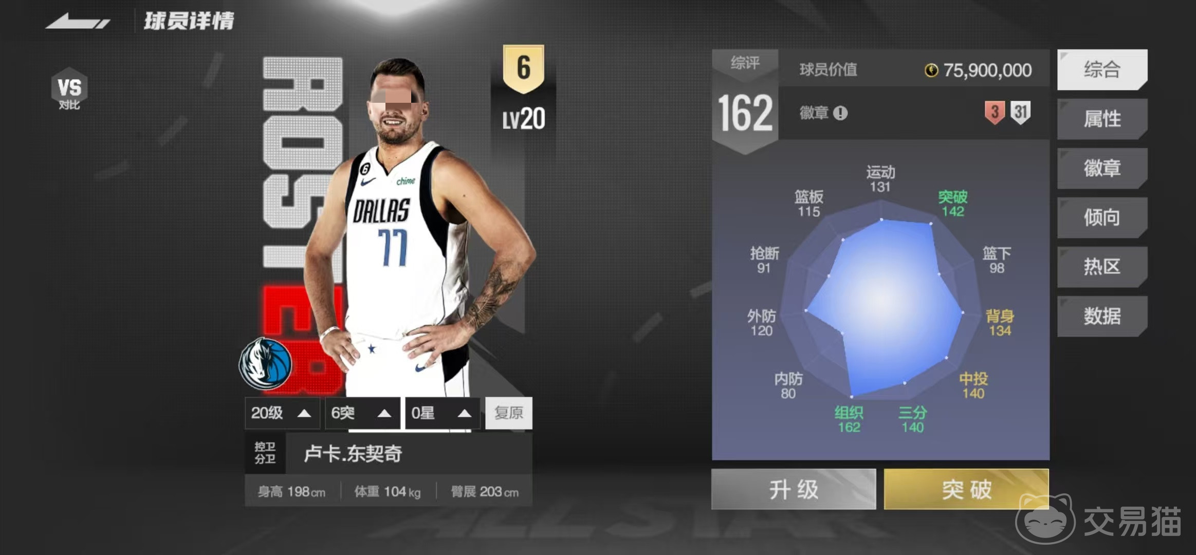 小编首先推荐的是卢卡东契奇,这是现在极其热门的人选,达到满状态下时综合评分高达162分。身高198厘米,体重104千克,臂展203厘米,拥有3枚铜徽章和高达31枚的银徽章,徽章数量足以傲视游戏中的绝大多数球员。属性方面,165突破上篮,162近距离投篮,140三分和140中投,这些得分手段都极为强悍,配合上自身超多热区,可以在外线疯狂的采用中投或三分来得分。