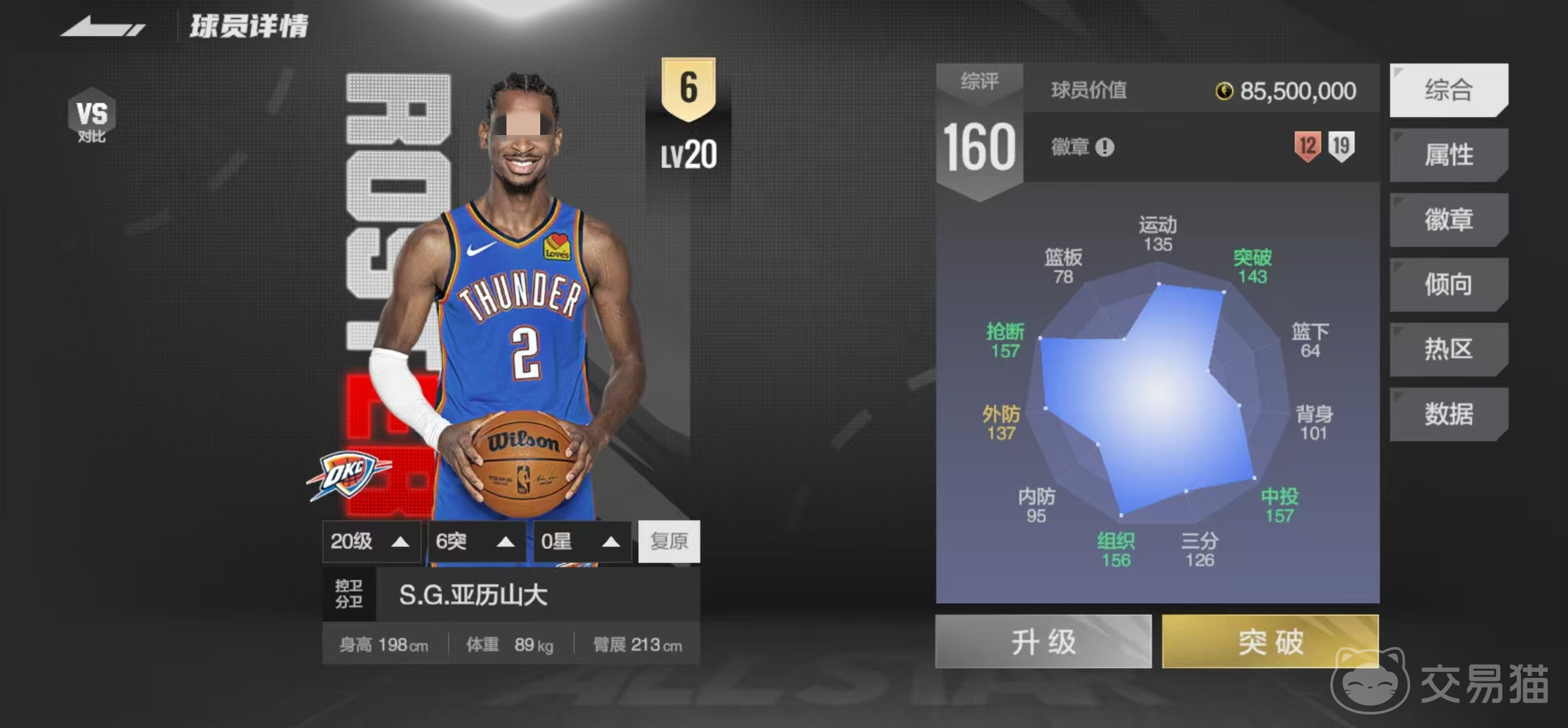 第2个推荐的是亚历山大,这名球员虽然比卢卡东契奇综合评分要少一些,但依然是顶级球星,徽章方面拥有12枚铜徽章和19枚银徽章,同样非常出色。身高198厘米,体重89千克,臂展213厘米,达到满状态的时候,在抢断、外防、组织、中投、突破等方面都有着很好的属性。例如自身中投157,突破上篮162,近距离投篮165等,都是很优秀的属性。热区方面覆盖的非常广泛,三分线外和三分线内以及秒区内都有着很好的出手热区。