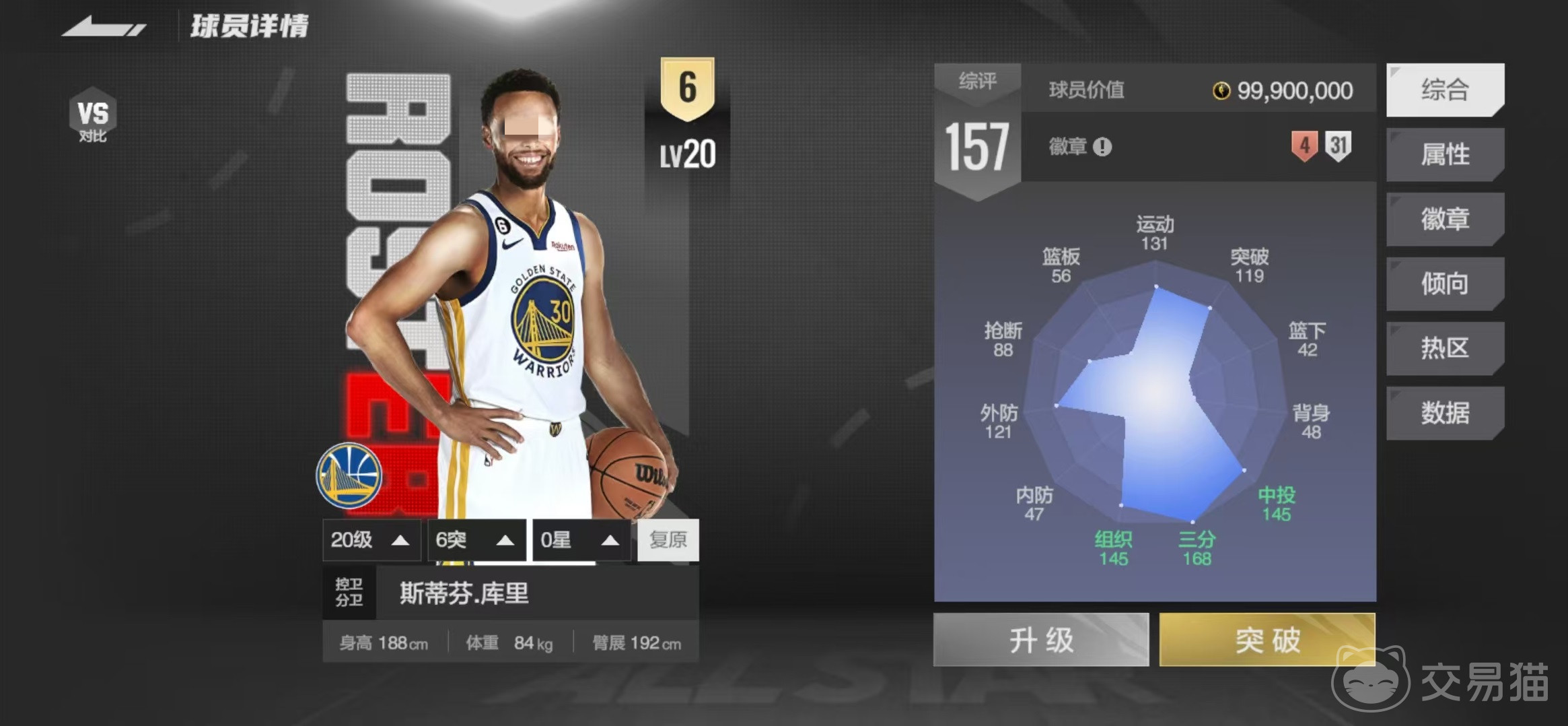 第3个推荐的是斯蒂芬库里,也是现在的知名球星,4枚铜徽章31枚银徽章,比卢卡东契奇毫不逊色。在属性方面,突破上篮160,三分168,中投145,在三分方面库里可以说是目前游戏中最为顶尖的一个。第4个推荐的是安东尼,安东尼身价非常高,11枚铜徽章13枚银徽章傲视群雄。155突破上篮和高达162的突破灌篮以及三分和中投能力,也是场上的得分高手。