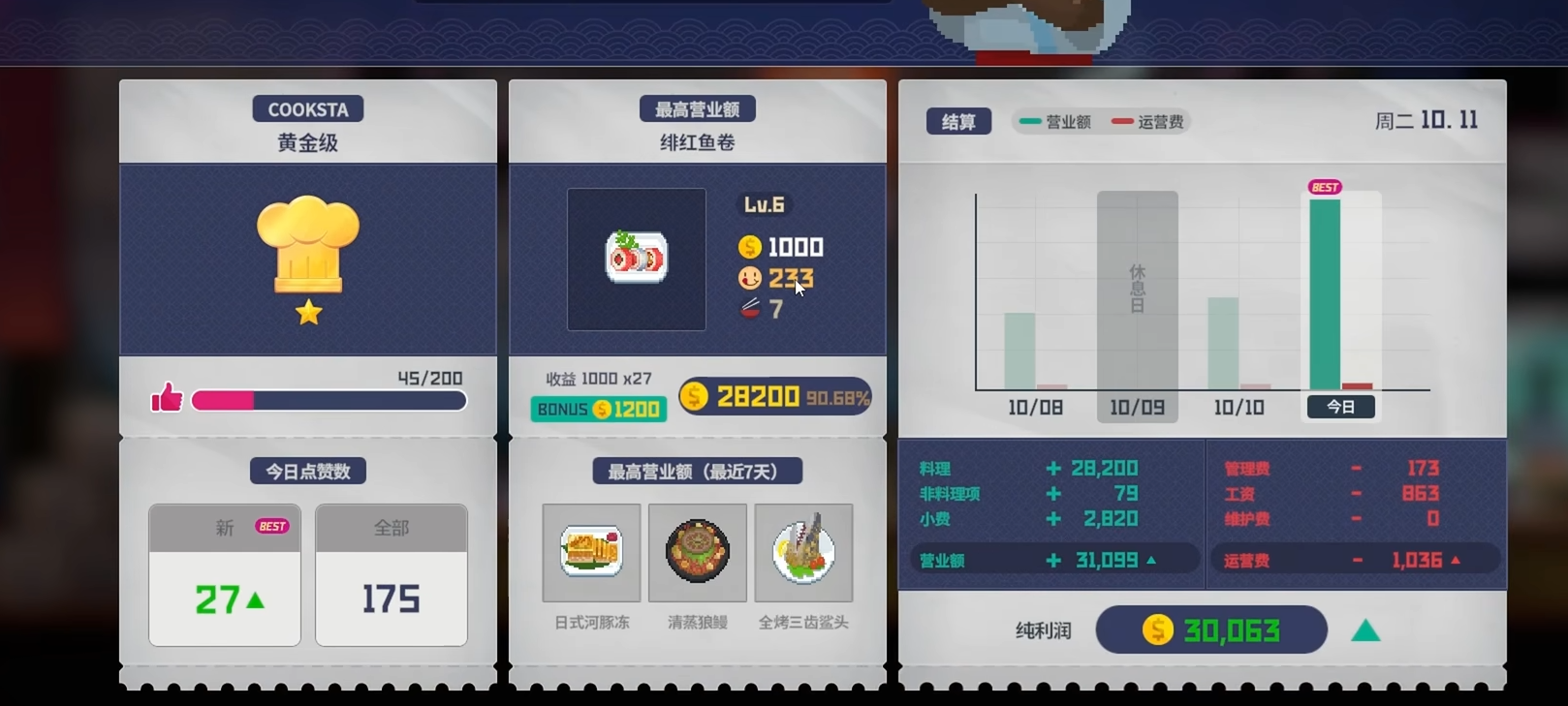 一、高性价比料理。其中包括绯红鱼卷、小飞象章鱼烧、三色鱿鱼。这些料理不仅美味可口,而且价格亲民,深受广大食客的喜爱。绯红鱼卷是其中的佼佼者,所需材料为大斑壁鱼3条、金眼鲷3条、长吻银鲛3条。他需要员工比利达到15级。他所需材料获取相对简单,满级时一份可出9盘,收益高,是员工料理中的佼佼者。小飞象章鱼烧所需材料为小飞象章鱼3只、小麦2杯、蛋黄酱1包。解锁条件为钻石店铺。他的趣味性高,收益可观,是后期经营的明星菜品,小飞象章鱼虽然捕捉难度较高,但其稀有性使得章鱼烧成为食客争相购买的珍品。三色鱿鱼所需材料为孔雀鱿鱼3只、吸血鱿鱼3只、乌贼3只、盐1袋。解锁条件为员工小刘达到15级。他的制作工艺复杂,食材消耗高,但售价惊人,顾客好评如潮,是后期冲击顶级店铺排名的核心菜谱。