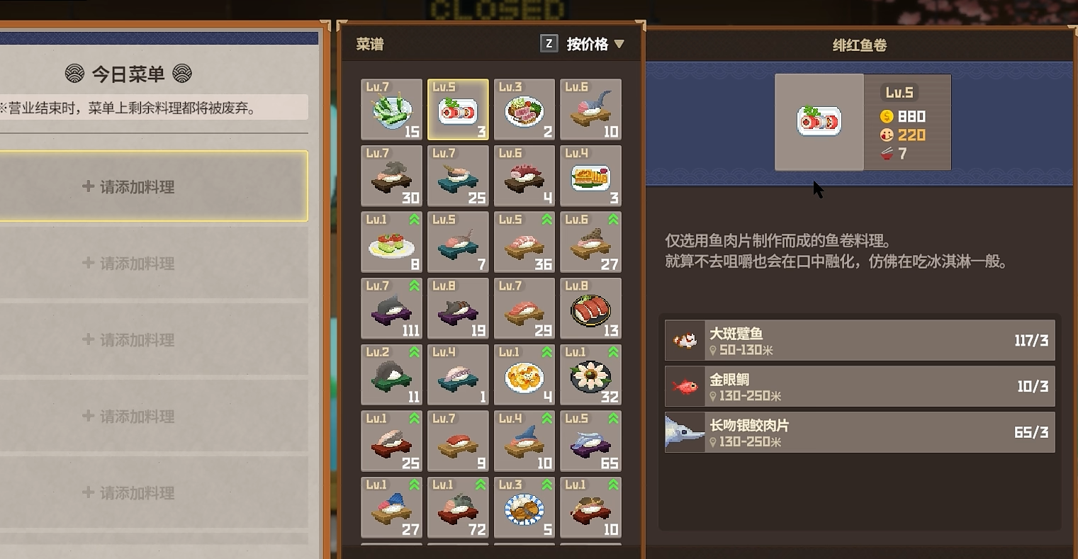 二、高收益料理。其中包括华美特级寿司套餐、冰鱼咖喱。华美特级寿司套餐所需材料为泰坦扳机鱼3条、青条鳃棘鲈3条、豹纹鳃棘鲈3条、白米3杯。解锁条件为完成导演任务后解锁。他的售价远高于普通菜品,是后期经营中不可或缺的主打菜,需要的食材较为稀有,但吸引力极高。冰鱼咖喱所需材料为冰鱼3条、大豆2杯、咖喱1包。他的配方简单,价值不菲,中期玩家不可错过的高性价比菜品,冰鱼常见于中深层水域,捕捉难度适中。