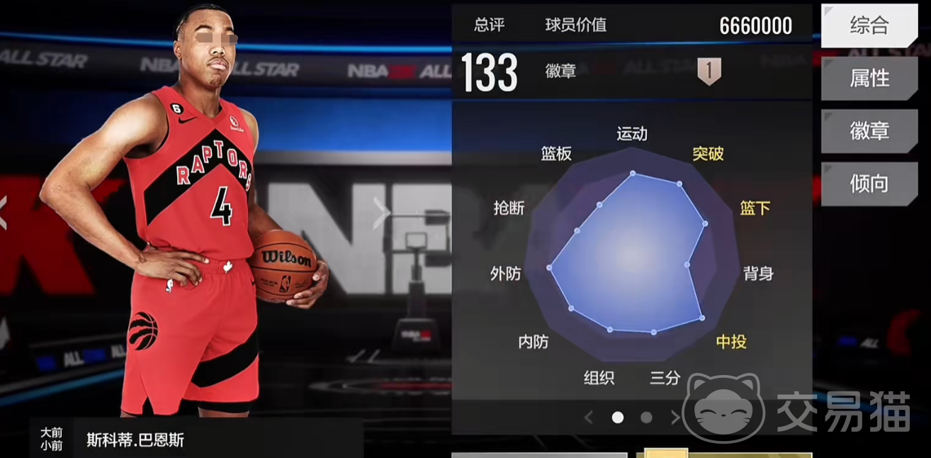 另外我们还可以通过徽章去提升我们的投篮命中率,例如3分射手就可以让你在3分线外更容易的命中篮筐。当你的投篮综合属性达到133点以上时,那基本上就算是比较合格的投篮命中率了。然后也有近身投球率,一般来说前方的近距离投篮数值会更高,因为本身的身高也高。