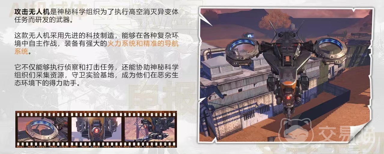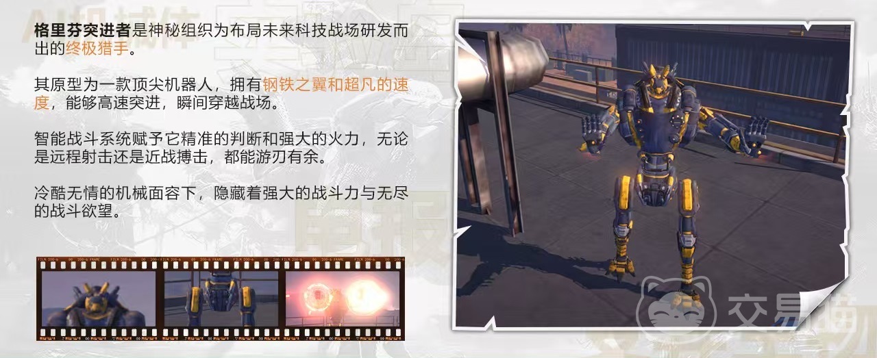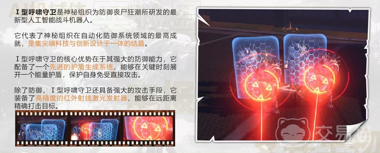 第1个是格里芬突进者,是一款顶尖机器人,拥有钢铁之翼和超凡的速度,能够在战场上高速推进,用智能系统带来了精准判断和强大火力,在远程射击和近战搏击方面都非常出色。第2个I型呼啸守卫,是为了防御丧尸狂潮所研发出来的人工智能战斗机器人,将各种尖端科技和创新结合起来,拥有强大的防御能力,配备了先进的护盾生成系统,可以展开能量护盾防御大量伤害,还具有高精度的红外射线激光发射器打击远处目标。