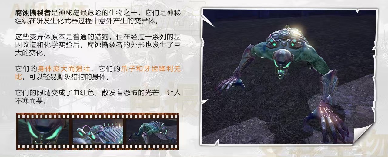 第1个变异生物是腐蚀撕裂者,是神秘岛上最危险的生物之一,由神秘组织在研发生化武器的时候产生的变异体。原型只是普通的猎狗,但是经过基因改造和化学实验之后,外形产生了很大的变化,现在变得极其庞大强壮。爪子和牙齿都非常锋利,可以轻易撕裂身体,战斗等级被评为两颗星。