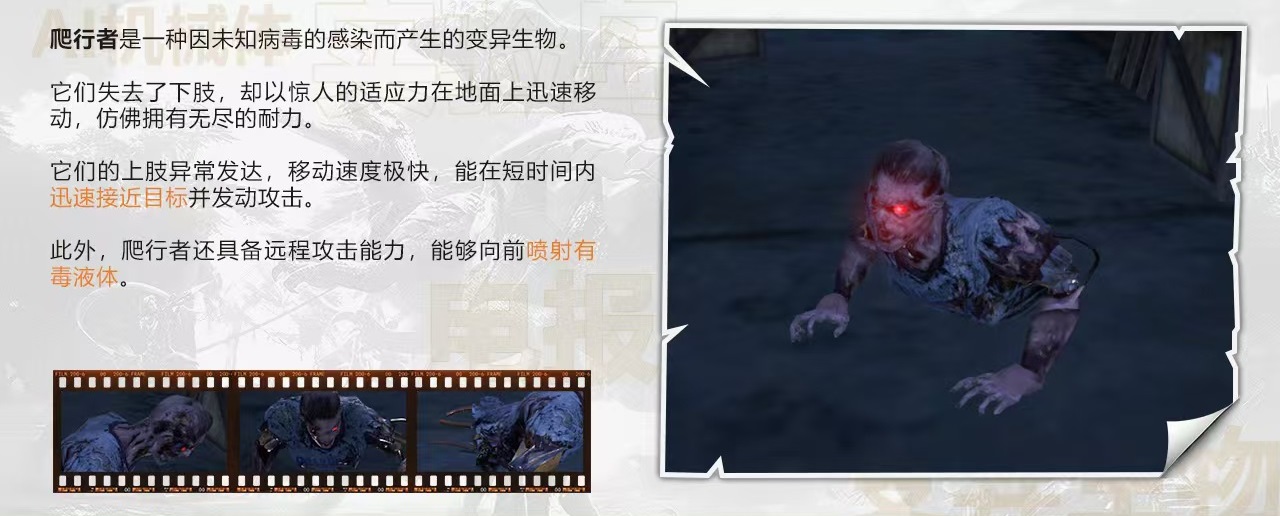 第3个是茧,茧的战斗等级最低只有一颗星,源自于强大世界树boss的分裂体,继承了世界树的神秘与力量,但不能直接进行攻击,它只是辅助单位,为boss创造攻击或恢复的机会。当玩家将这些茧打爆的时候,会释放出体内的腐蚀性液体,接触到后也会持续受到伤害。第4个是爬行者,因为未知病毒感染而产生变异的生物,失去了下肢,但是却拥有惊人的适应力,可以迅速移动。上肢异常发达,移动速度很快,还具备远程攻击能力,能向前方喷射出有毒的液体,所以大家千万不要因为它的外形而轻视。