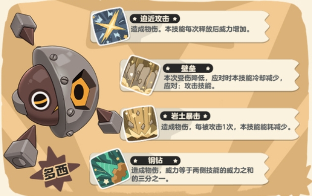以上就是洛克王国世界多西技能有哪些的介绍内容了,在洛克王国的精灵世界中关于精灵的内容有很多,为了方便玩家们了解这些精灵的特性,其实可以通过他们的属性来了解他们的技能特性,像多西这样的双系精灵,可以从机械系和土系两个属性来了解它的技能特性。