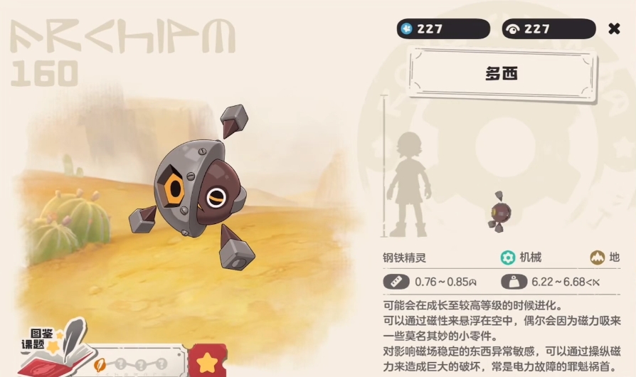 多西属于是机械系+地系双系的精灵,所以在外形上多西一半是金属外壳,一半是土球,依靠磁性悬浮在空中,在身边周围还有几个带磁力的图刺,而且多西是幼体形态,一旦进化成库多西之后在形态上会发生很大的变化,要是再次进化成波多西的话,将进化成机械侠这样的形态。