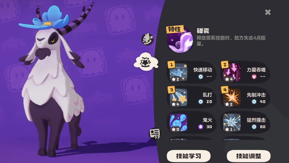 在他的技能上有【乱打】、【快速移动】、【力量吞噬】、【猛烈撞击】等,在特性上是【碰瓷】,这个特性一旦释放能让对方直接是失去4点能量,本身一个精灵在出场时就会消耗掉一点能量,要是一个技能再失去4点技能,那很有可能直接结束本次战局,所以说当进化成为了花影羚羊后,在技能输出效果上会更好。
