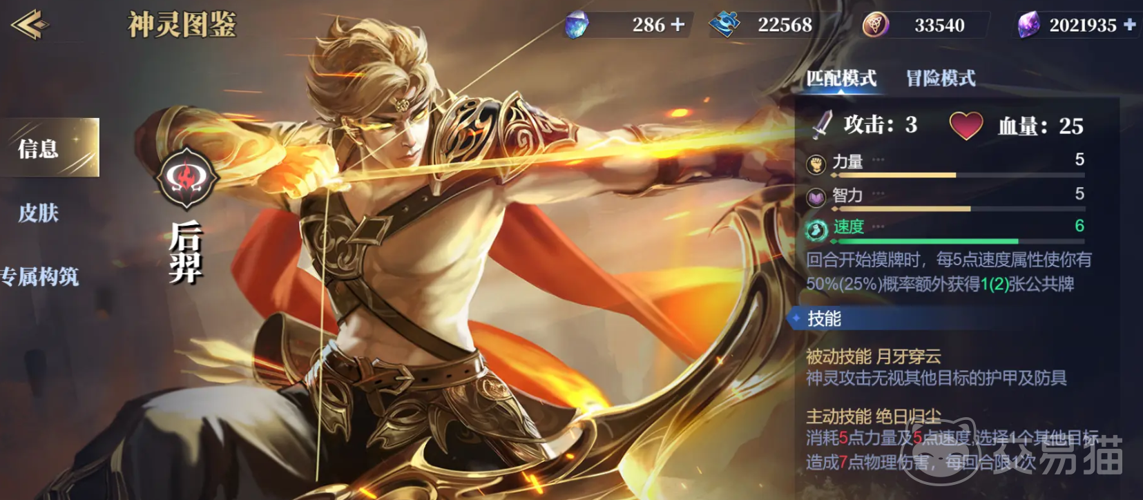 后羿初始攻击力为3,有25血量,他的被动能让自己的攻击无视目标的护甲和防具,主动技会消耗5点力量和速度,选择一位目标形成7点物理伤害,每回合限一次,这些招式让他有强大的进攻能力,唯一的缺陷在于需要消耗掉自身10点属性值才能用,所以主动技建议用来作为斩杀的手段,大家可以为其装备上射日弓和力量之剑,射日弓能在每回合首次连击时,对目标额外形成3点物理伤害,力量之剑则是每次攻击提升自己的2点力量属性。