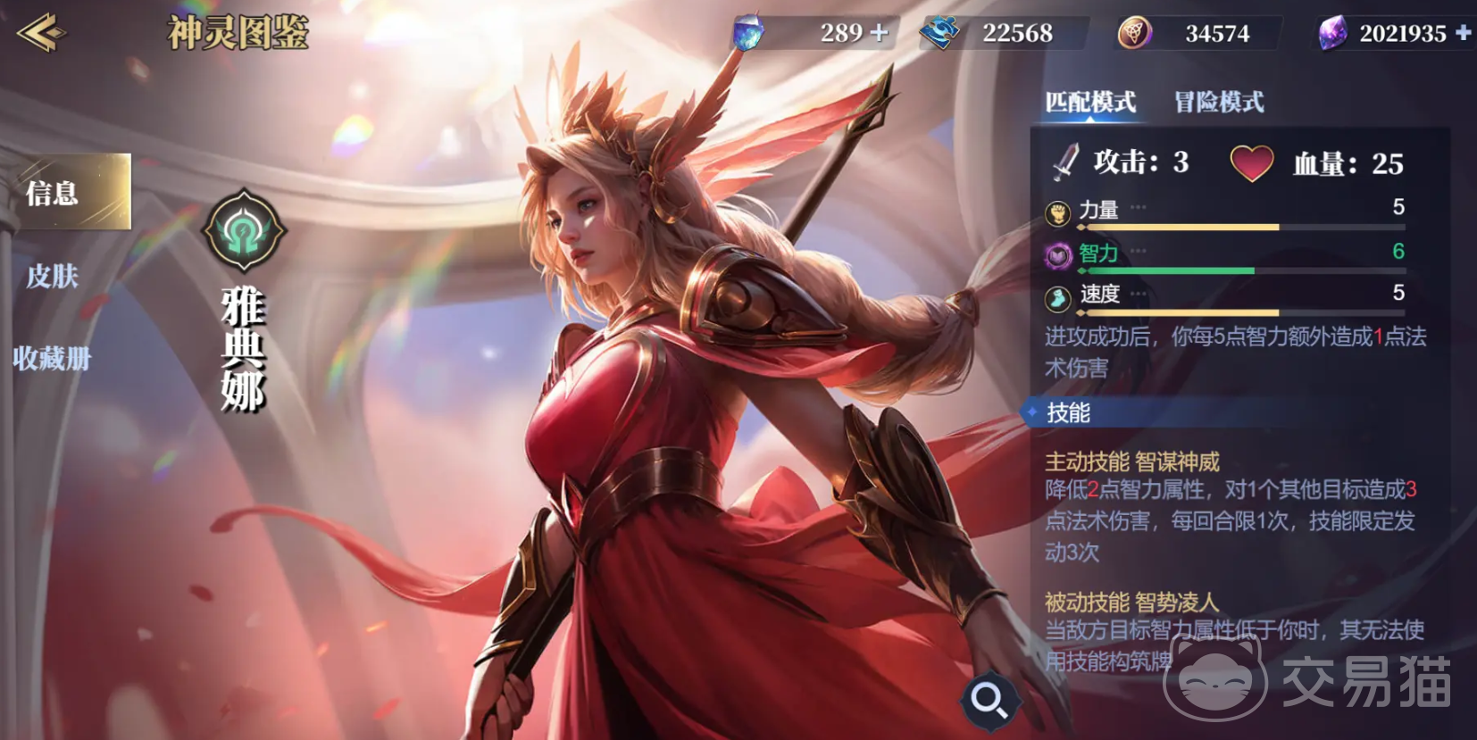 雅典娜初始攻击力是3、血量25,被动技会在敌方智力属性低于自己的时候,无法使用技能构筑牌,主动是消耗自己的2点智力,对1个目标形成3的法术伤害,每回合限1次,我们在为她搭配时可以尽量关注好属性的增加与减少,携带效果能提升自己智力或者削弱敌方智力的,比方说智慧宝石等,让对手在对局中难以使用技能,从而成功获胜。