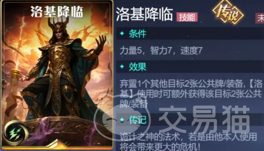 洛基虽然攻击力有限,但却有着充满欺骗的法术,他初始是2点攻击、25点力量,技能“狡诈窃取”和窃取其他对手的公共牌,提高自身的连击数同时降低对方的攻防,他的“降临”技可以帮助放弃目标2张公共牌,自己额外获得目标的2张,这些效果能让他越到后期越强,所以宝物卡方面可以选补天石,用它不断的过牌能力,来触发技能。