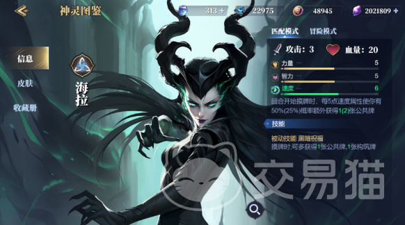 海拉初始攻击为3点,血量为20,她的技能“黑暗祝福”能在每次摸牌的时候,多获得1张公共牌和1张构筑牌,也就是说能在每次出击时比对手多摸两张牌,配合上速度觉醒能得到大量手牌,不过因为海拉的身板比较脆,只有20点的血量,这使得其只适合快速战斗,如果没有短时间内把对手打败,开始长久消耗的话,很容易就因为续航不足而失败;