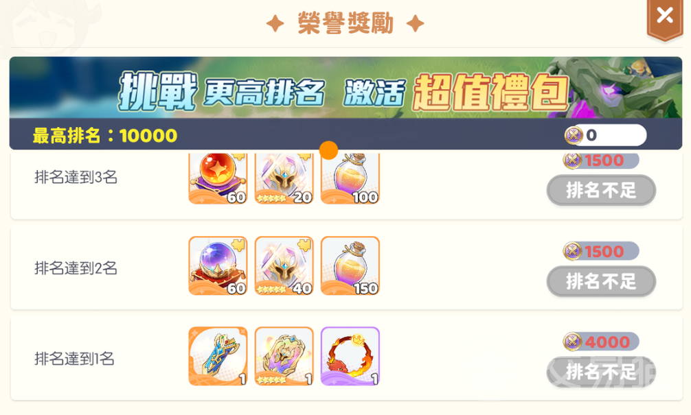 再就是神界裂隙第一层通关,神界裂隙每两天重置一次,首日尽量完成第一层挑战,为次日攻略第二层做准备。建议手动释放奥义技、调整站位,以确保万无一失。最后是竞技场排名进入400名以内,竞技场排名影响每日奖励及竞技币获取,首日尽量冲至400名以内,确保每日排名奖励达300钻以上。同时,第一次达到新排名可获得钻石奖励,如果还有挑战机会,适当购买额外次数以获取更多资源。