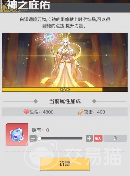 四象阁中还有一个神之庇护的功能,通过使用时空结晶向白泽祈愿,能进一步提升上阵英雄属性加成。时空结晶比较稀有,只有少数活动才可以获取。神之庇护等级也并不是没有上限,它等级上限受到四象阁等级限制,四象阁等级越高,神之庇护等级上限也就会越高。简单来说,大家在游戏中一定要多抽卡,尤其是去抽五星角色,也要及时提升星级,因为这些都会转化为四象阁对战力的提升。