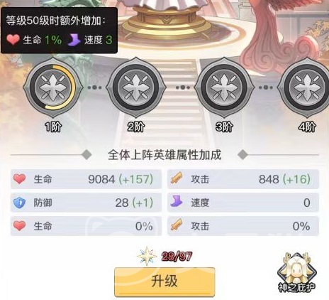 提升的属性非常全面,包括生命、防御、攻击和速度,以及生命百分比和速度百分比,在等级提升时还有相应的节点。例如在达到一阶时,也就是等级50级时可以获得额外1%生命值加成和3点速度,后续还有二阶、三阶、四阶等。速度是最重要的属性,因为能够提升速度的方面非常少,这也是四象阁受到玩家重视的原因之一。