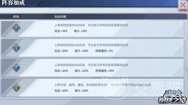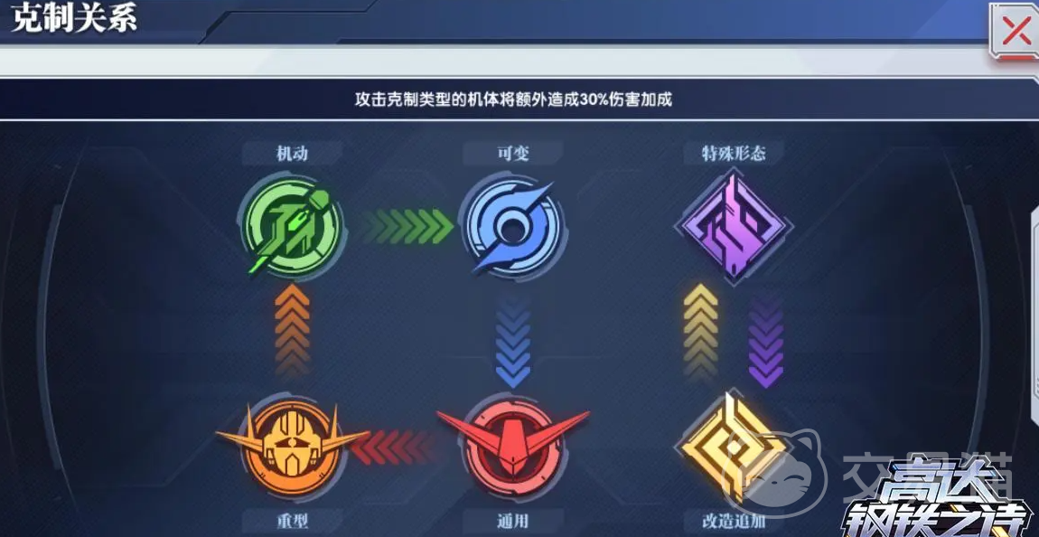 了解机甲最重要的类型、特性,机甲信息页面的左上角可以查看。目前有6种类型、5种特性。6型类型有相互克制关系,具体如下图所示。例如机动类克制可变类,可变类克制通用类。上阵同类型的有加成,而上阵满足特定类型组合的也会激活特定的加成。