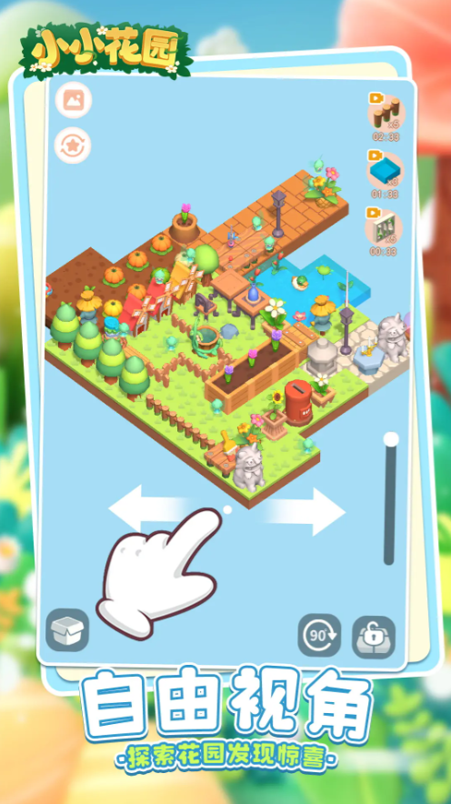 小小花园游戏玩法很简单,通过消除关卡解锁土地后,玩家可种植花卉、农作物并逐步升级花园规模。但游戏得创新玩法是将传统消除玩法与策略性经营结合,例如在微型胶囊或球体空间内布置植物时,需通过旋转、调整机关等操作,既考验了玩家的空间规划能力,又增添了类似拼图解谜的趣味性。视听体验是游戏另一大加分项。明快的色彩搭配、动态天气系统,如雨景、夜景以及轻松的背景音乐,共同营造出沉浸式解压氛围。