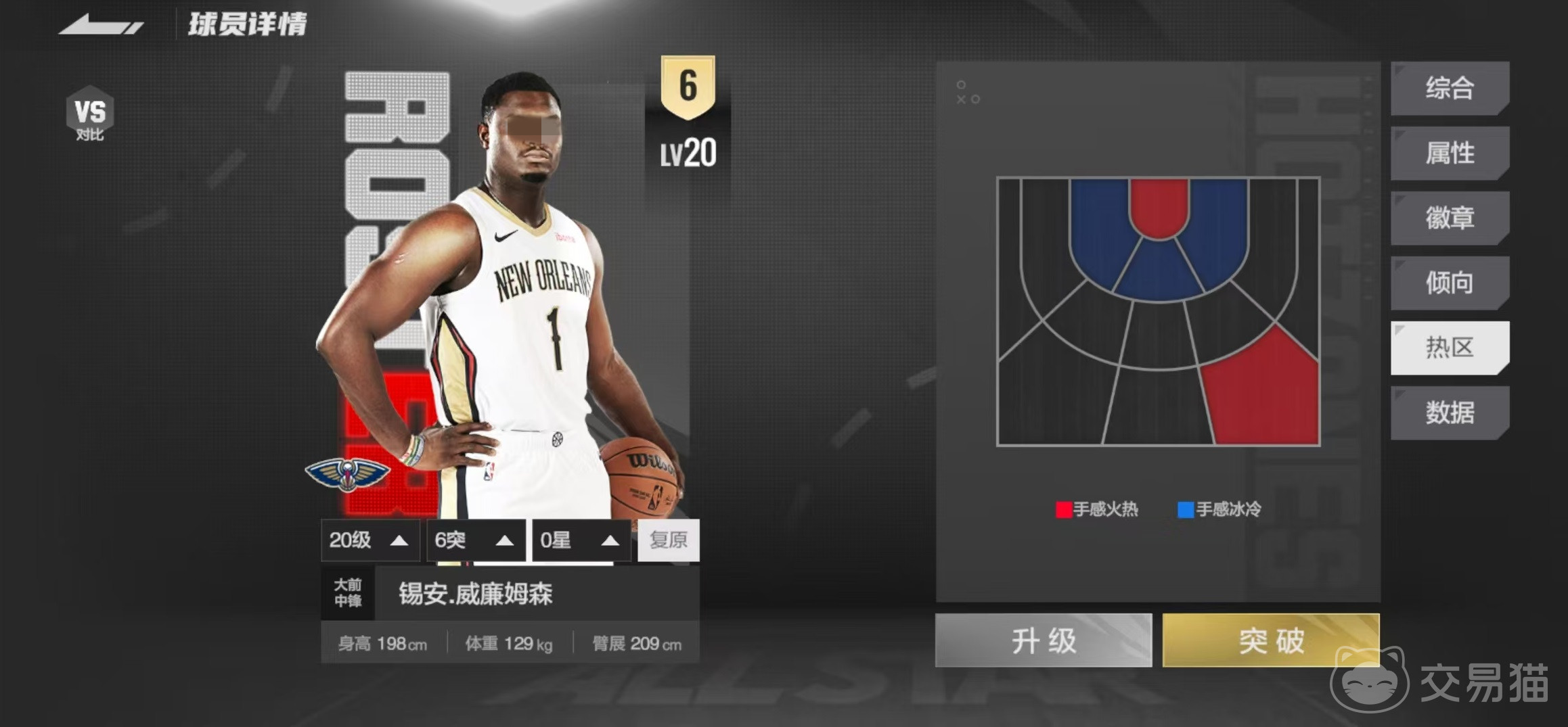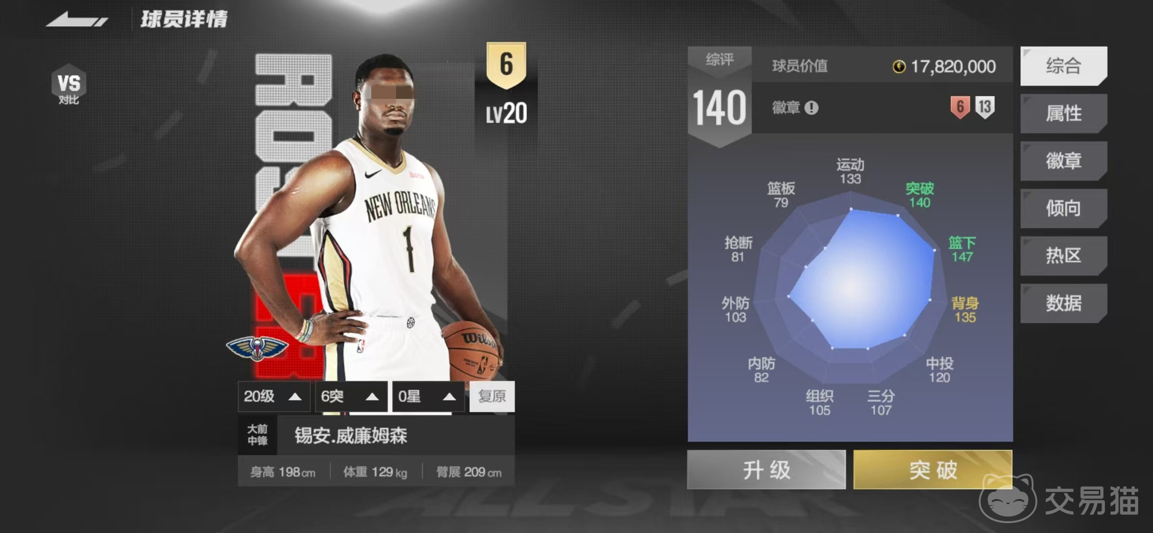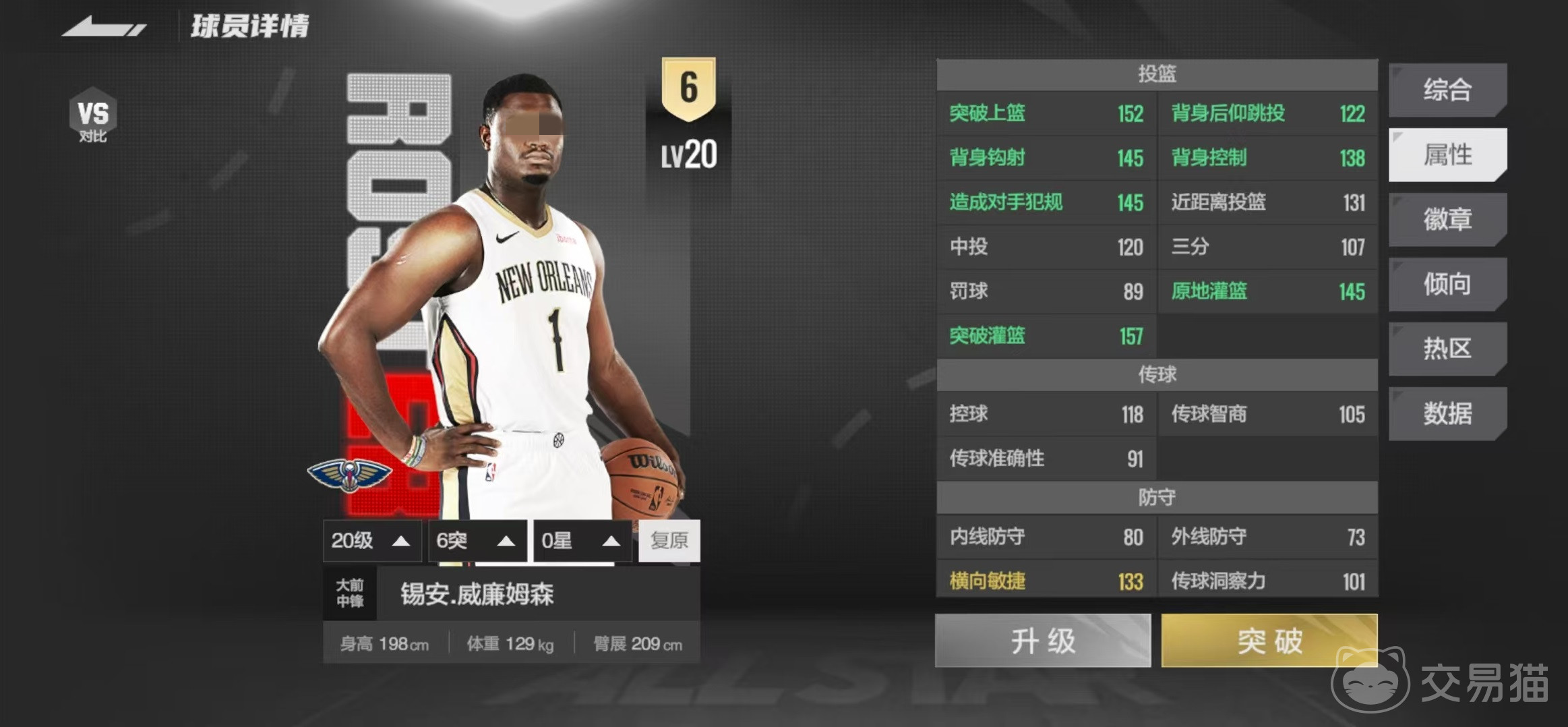 这名球员的全称是锡安威廉姆斯,当达到20级6突的时候,也是有着很不错的雷达图属性,它在模板方面身高198厘米,体重129千克,臂展209厘米。是一名大前锋或者是中锋,这样的身体模型在大前锋中还是不错的,不过如果去玩中锋,更多还得依靠属性和徽章上的优势。先来看一下属性中的投篮属性方面,突破上篮1 52,背身后仰跳投122,背身钩射,原地灌篮145突破灌篮157,中投120,三分107。