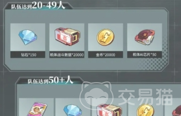 另外就是可以选择组建队伍,等队伍里的成员达到指定的数量之后也能得到钻石奖励,就比如队伍的人数如果能达到 20人以上,那就可以直接领取150个钻石加上2万金币,当然还有对于玩家来说非常重要的,机体ai芯片50个,另外还能得到机体战斗数据2万个。