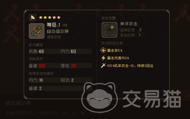 要想学习这种音律类型的武功,那最好是能把角色的悟性提升到20点以上,这也是学习幽怨错杂弹的必要条件,另外音律数值需要达到100才可以,学会这个武功之后,可以提升角色150%的暴击伤害,能让角色的战斗能力得到大幅度的提升。