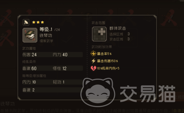 首先就是在岳麓书院,通过战斗玩家可以获得铁琴功,这应该是音律流派里最强的一个功法了,使用这个武功之后,假如遇到的对手能力比较弱的话,有很大的几率一击制胜,并且铁琴功在对战的过程中,还有群攻的效果,可以借助这个技能给对手多名成员带来伤害,学习这个武功是有要求的,玩家必须要让音律数值达到60,另外还需要让悟性超过12点。