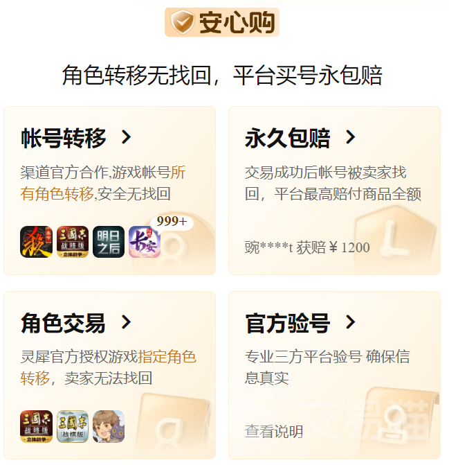 首先大家在买号的过程中,最怕的不是人为的问题。而是出现一些不可抗的因素,例如被盗号。这时就可以选择带有永久包赔的商品,或者自己选购一份。这时当出现意外的话,那就会根据你所下单的金额赔付给买家,如此你就不需要承担这些隐藏的风险,安全性更高。