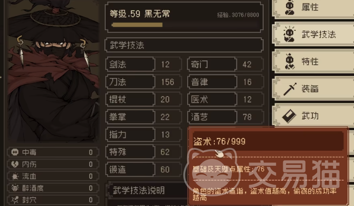 但想要掌握这一项功法,是有很多要求和条件的,首先就是在初期选择角色之后,可以给角色增加不同的天赋点,这个时候玩家就可以选择盗术的特性,游戏里会有一个临安城,可以在临安城这里去购买虎皮帽,这是能增加玩家盗术点数的装备,另外还需要去黑市购买奇门盗术这本秘籍,除了这些条件之外,另外一个非常重要的就是,玩家需要保持角色较低的道德数值,可以在前期游戏的过程中,去选择一些减弱道德数值的选项。