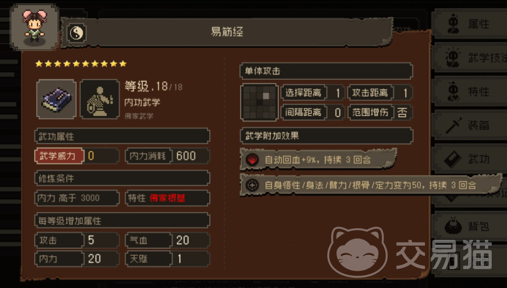 最后就是易筋经,这是游戏中的顶级内功之一,拥有超高的内力成长加成,修炼后,能大幅提升角色的内力上限,为施展高消耗武学提供充足的能量,同时,它还能增强角色的防御力,赋予角色一定的抗击打能力,在战斗中减少受到的伤害,最为独特的是,易筋经具备强大的疗伤效果,可在战斗中持续恢复角色的气血,极大地提升了角色的生存能力,但是虽然这本绝世内功能给玩家带来不菲的实力提升,但是获取难度也不小,小编建议玩家在拥有了较高的角色等级和实力之后再去获取。