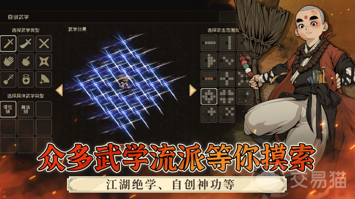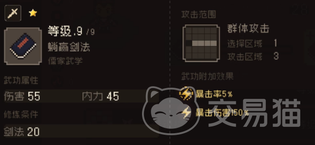 首先要提的,当然是你刚进入游戏时,便能够轻松获得的躺赢剑法。这是一种群体攻击型的剑法,虽然单体伤害不算惊艳,但在战斗中能覆盖三格范围的攻击非常适合打击一大群敌人。更重要的是,躺赢剑法还是你打开江湖大门的敲门砖,基本上是每个玩家的必备基础。