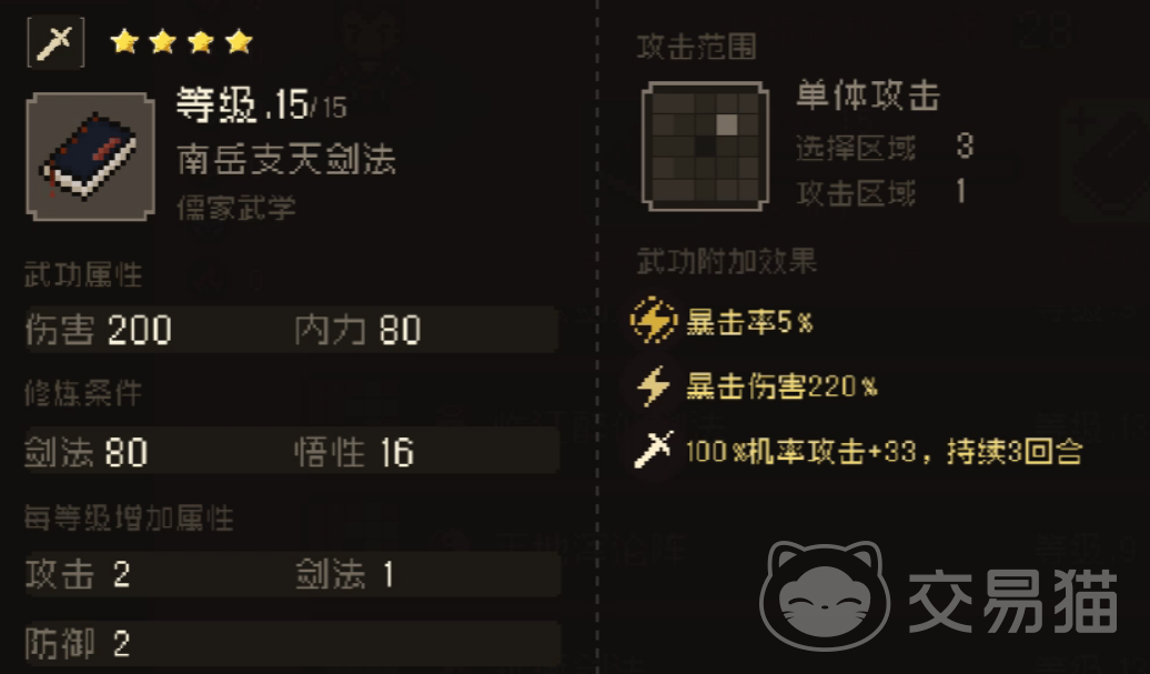 如果你在游戏的中期遇到了瓶颈,或者觉得自己的攻击力有点跟不上节奏,那么南岳支天剑法绝对是你的救星。作为中期最强的剑法之一,它能提供非常可观的伤害加成。修炼此剑法的条件是剑法造诣达到80点,悟性需要16点。每次升级时,你不仅能获得两点的攻击力加成,还能提升一点剑法造诣,同时加强防御数值。最令人激动的是,南岳支天剑法还能对敌人造成高爆发的单体伤害,并且暴击伤害达到了惊人的200%。如果能顺利获得这把剑法,游戏中的战斗力会大幅提升。