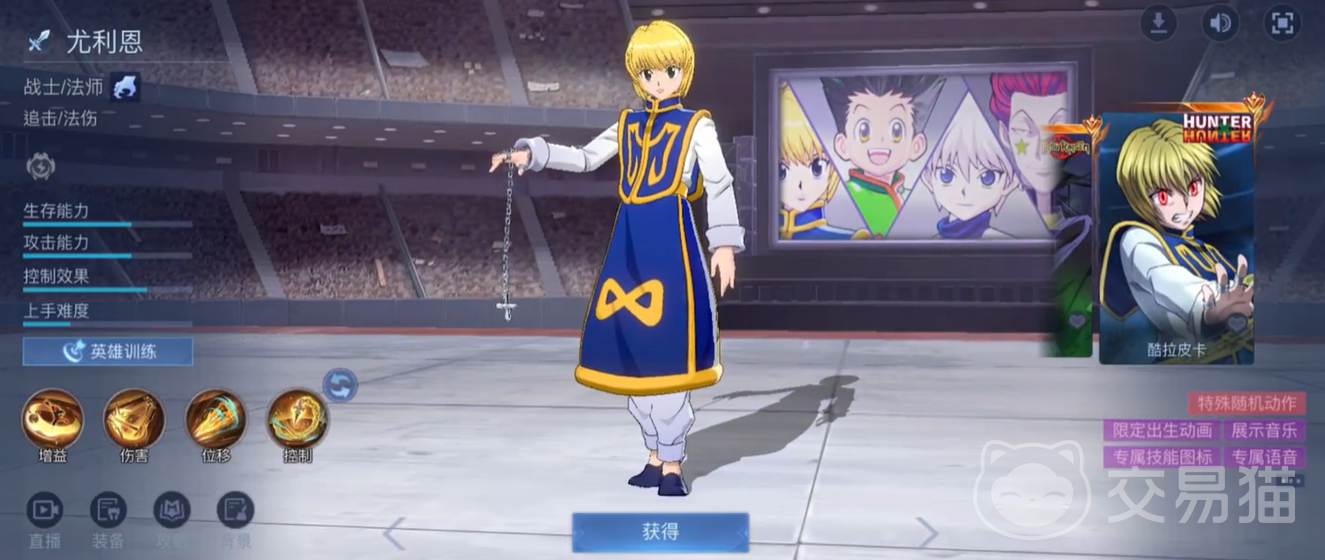 接下来是酷拉皮卡主题皮肤,它赋予了尤利恩一个令人眼前一亮的新特效。酷拉皮卡那标志性的金色锁链特效,完美地体现在了游戏中,简直让人看了就想默默感叹一句特效真香。不仅如此,每当你击败敌人时,还会出现特殊的KO字样,仿佛每次战斗的胜利都能得到酷拉皮卡的荣耀加持。如果你是酷拉皮卡的粉丝,这款皮肤绝对是你的必选之物。