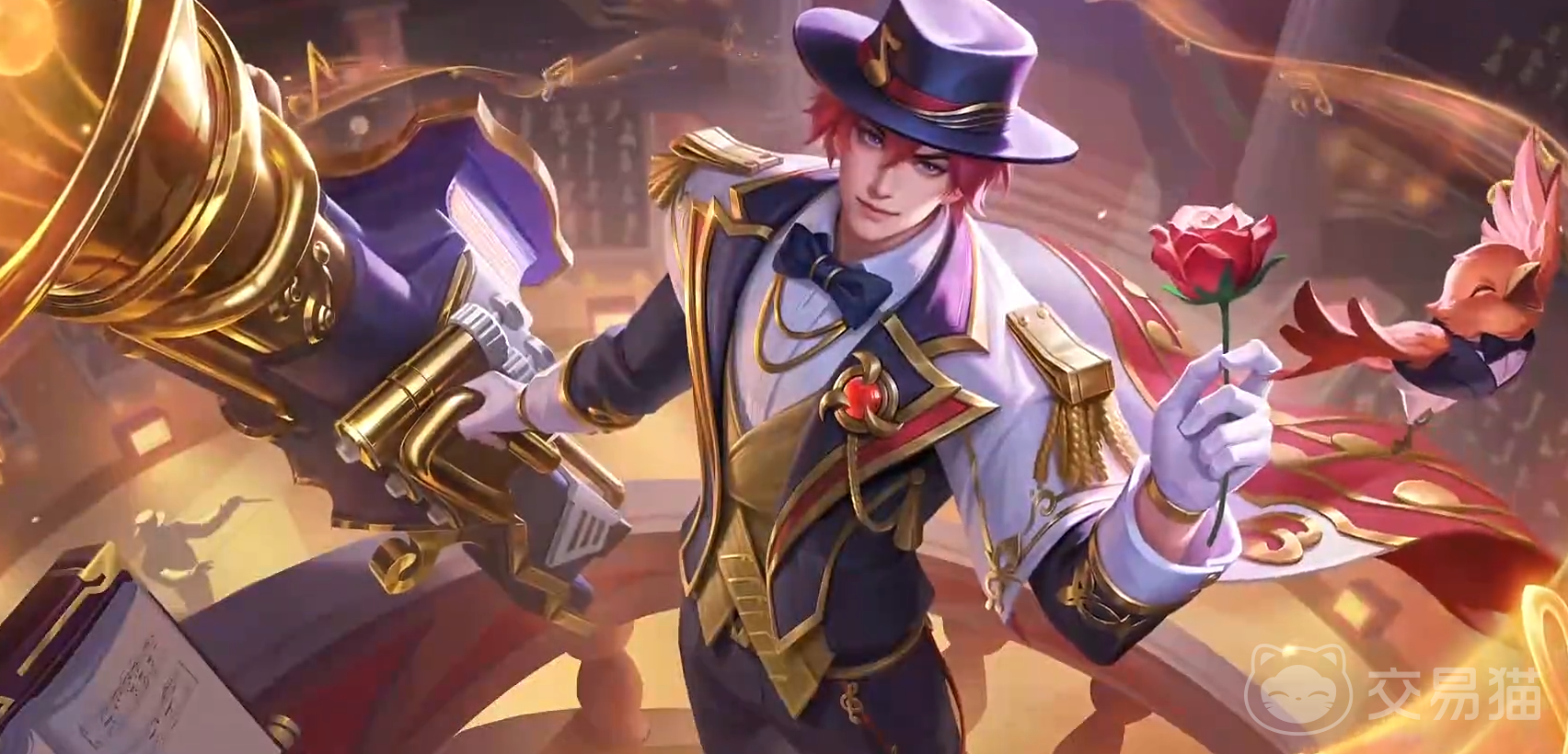 武器是萨克斯的外形,在这之上还加入了风琴与乐谱元素,特效整体以金黄色为主,页面展示时的他将会站在舞台高处,手持玫瑰,嘴角微微上扬,用优雅的姿态开始自己的演奏。