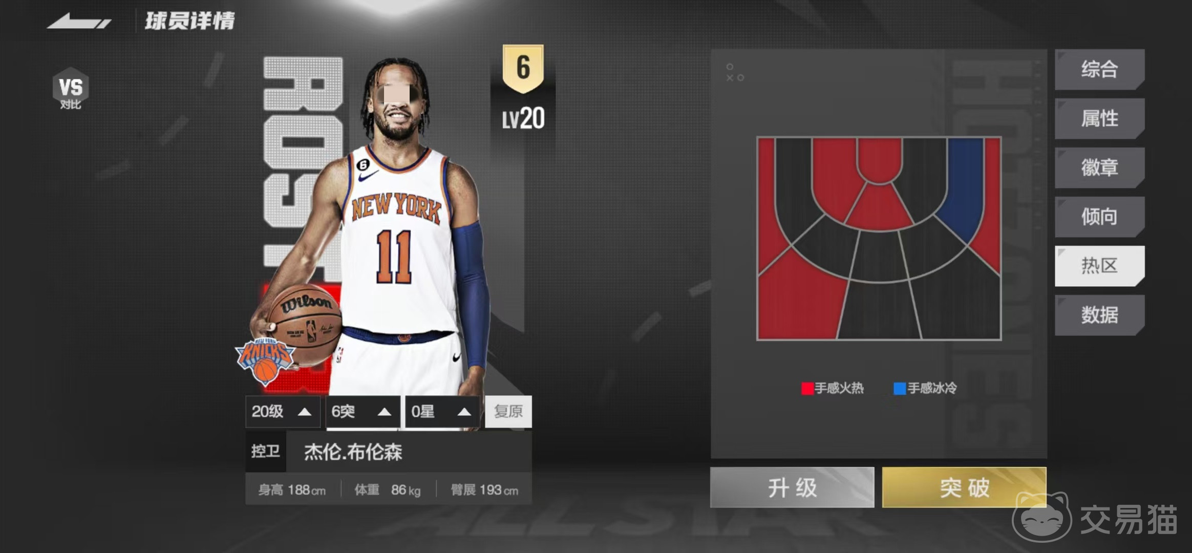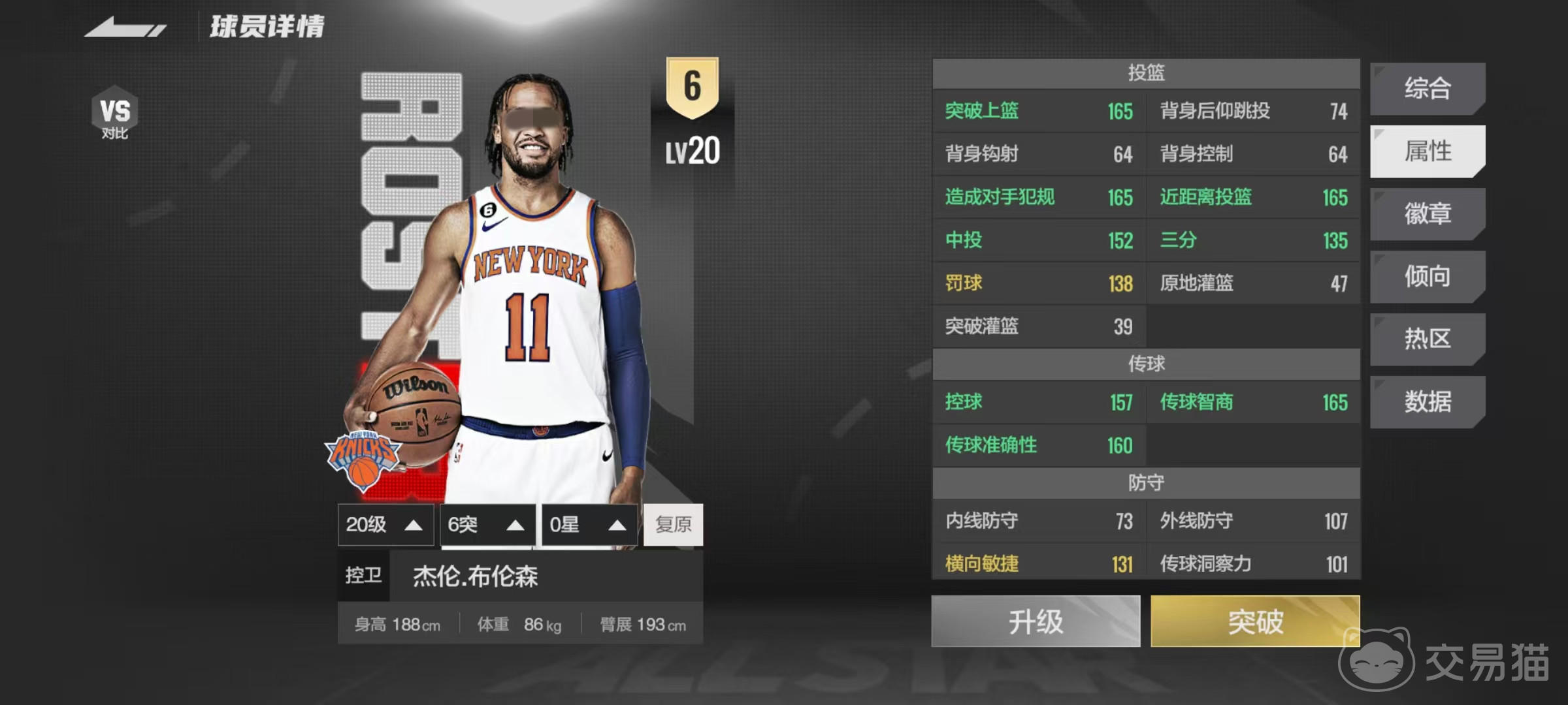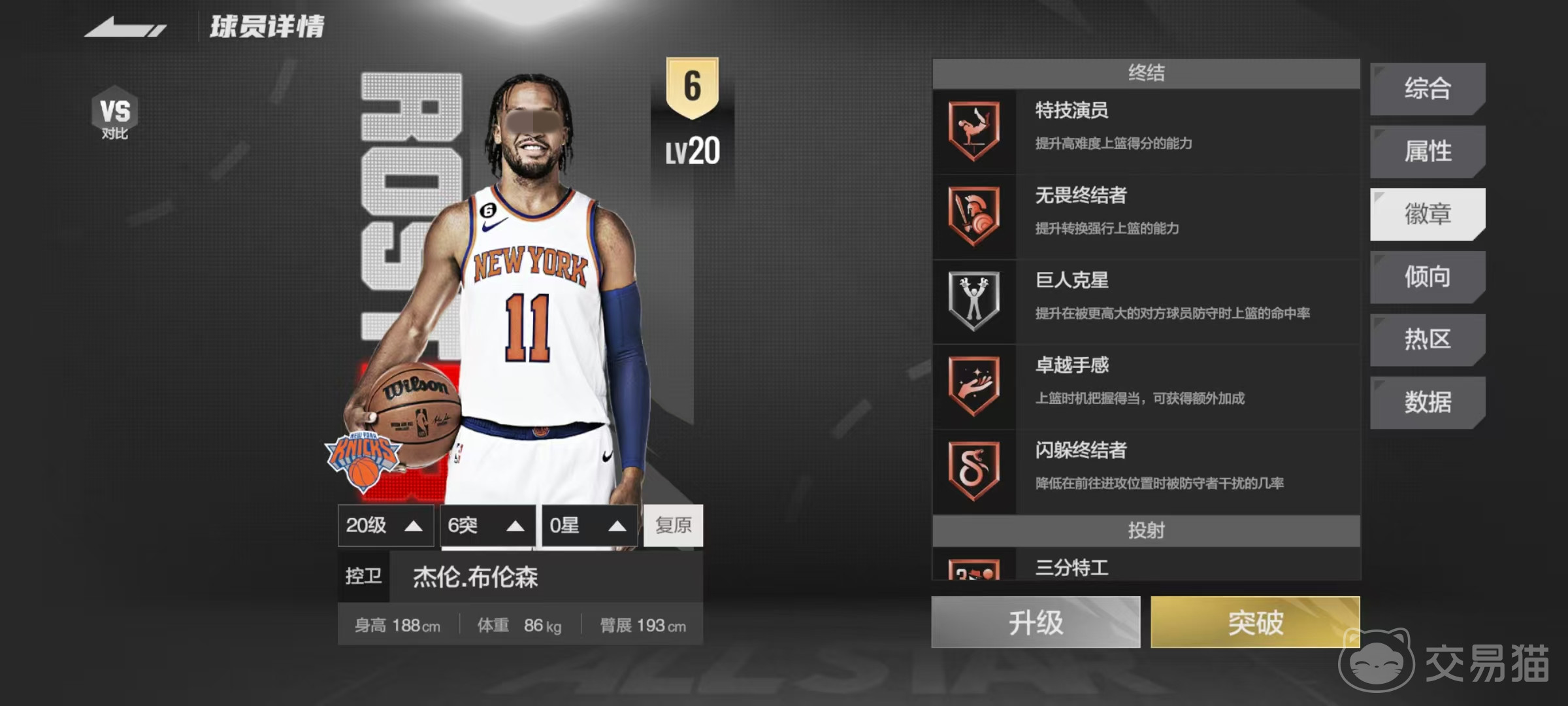 布伦森全称是杰伦布伦森,是一名很出色的控球后卫,他的身高188厘米,体重86千克,臂展193厘米,在后卫中还是属于中规中矩的模板。作为一名后卫,他的突破能力非常强,组织、三分和中投这些属性也都比较抢眼,更重要的是他拥有16枚铜徽章和15枚银徽章,在徽章方面就碾压了很多选手。徽章的分布方面,其中投射一共有12枚,组织有14枚,终结有5枚,除了防守之外,其他方面几乎都可以打出很好的效果。