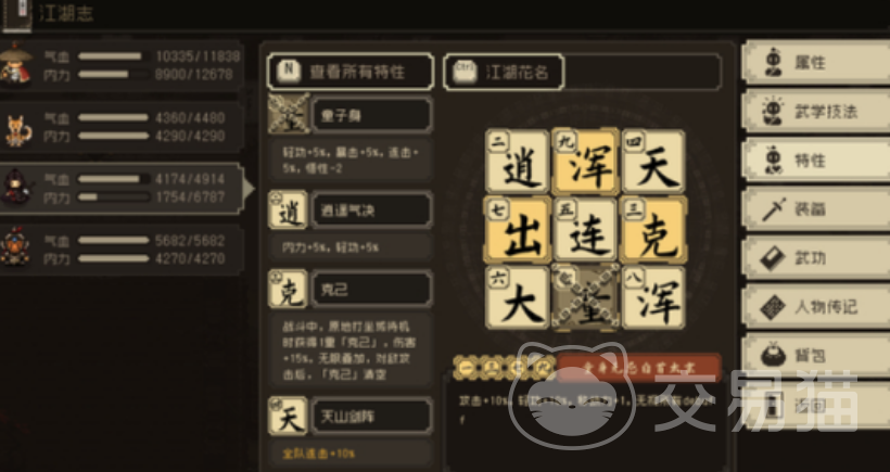 首先,推荐的第一组组合是童身功+浑行无穷正象天,它组合后的特性为“童身无忌白首太玄”。这套组合的实用性非常强,搭配后,你不仅可以提升1点移动力,增加10%的攻击力和轻功属性,还能最酷的是——完全免疫所有debuff。在面对一些让你掉血、减速或者眩晕的负面状态时,简直是大杀器。感觉有点像是江湖中的无敌状态,可不要错过。