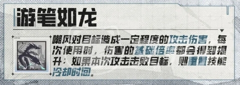 第三个技能游笔如龙,是嘲风的又一强大攻击手段,当嘲风施展游笔如龙时,它会以排山倒海之势对目标发动猛烈攻击,造成一定程度的攻击伤害。每次使用这个技能,伤害的基础倍率都会得著提升,这意味着随着战斗的进行,嘲风的攻击会越来越强力,让敌人难以招架,而且如果本次攻击成功击败目标,那么该技能的冷却时间将会重置,这一独特的机制使得嘲风在战斗中能够不断地对敌人进行打击。