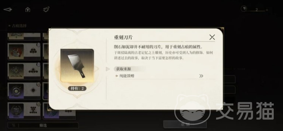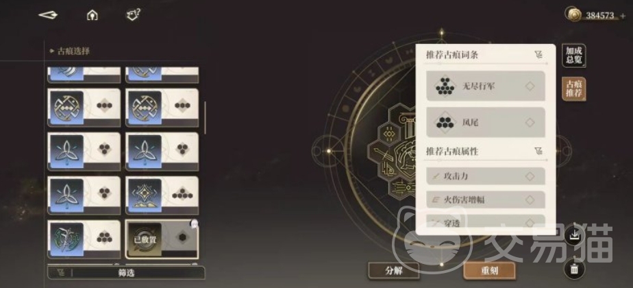 每一次合成只有精心收集和合理搭配低阶古痕,才有可能获得梦寐以求的高阶古痕,此外将古痕拆解后,玩家还可以得到一种珍贵的道具叫做宿命之印,这些宿命之印可以在命运商店里兑换到低阶古痕,然而在追求古痕的道路上,玩家有时可能会遇到属性词条不满意的情况,当遇到这种情况时,游戏中提供了一种特殊的工具叫做重刻刀片,使用重刻刀片,玩家可以为古痕进行重塑。