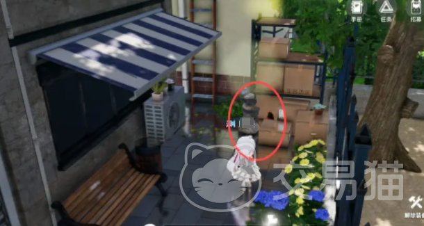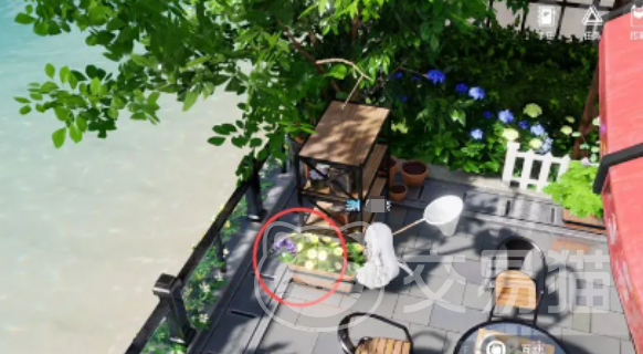 沿着楼梯继续向上能看到一个咖啡厅,在这个咖啡厅前面有一棵大树,树下会有紫色的花朵,靠近花朵就可以直接采集起来,沿着道路继续向前,就走到了咖啡馆的最顶端,在花架旁边会有一盆白色的花朵,靠近这里之后就能收集昆虫。