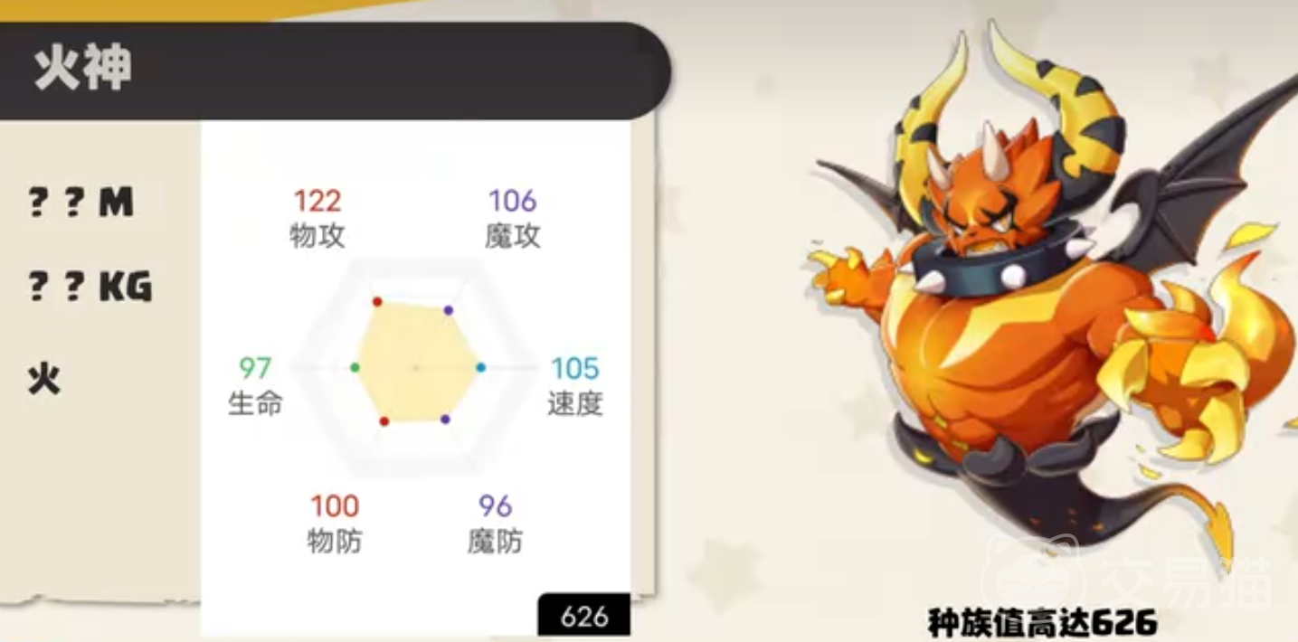 浑身非常热只要靠近它就能感受到温度上的急剧变化,它的特性是每次释放火系技后威力加15,它的“炎枪”会对敌方形成火属性的魔法输出值,“火焰冲锋”会带着火焰前冲,对敌方形成物理输出值,它的“撕咬”会进行2次连击,形成物理输出值,若自身的生命低于50%,则连击加2,“热身”会在下一次行动时,让攻击技威力翻倍。