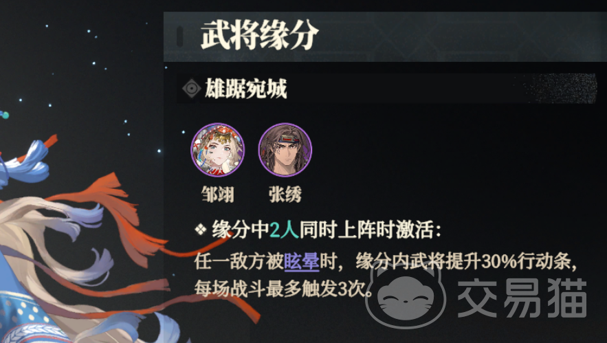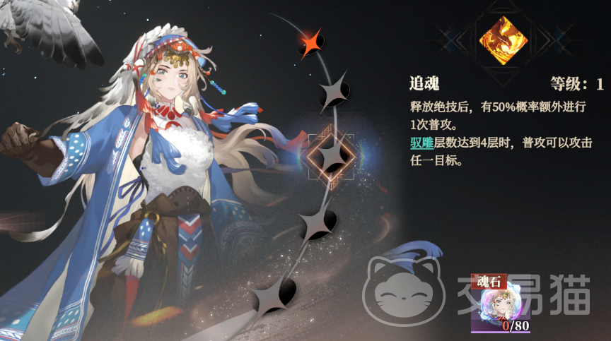 再看看邹翊的突破技“追魂”,在使用绝技后会有50%概率进行额外一次普攻,如果驭雕的层数达到4层普攻可以攻击任一目标。武将突破5星的时候可以达到100%概率。这里的“驭雕”是通过天赋获取的被动效果,能给普攻增伤,最多能叠6层。